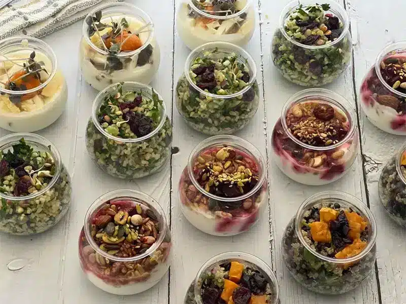 - פירות – ניתן להגיש מגוון רחב של מגשי פירות טריים, כגון ענבים, תאנים, תפוחים, אגסים, תותים, בננות, ועוד לפי עונות השנה.\